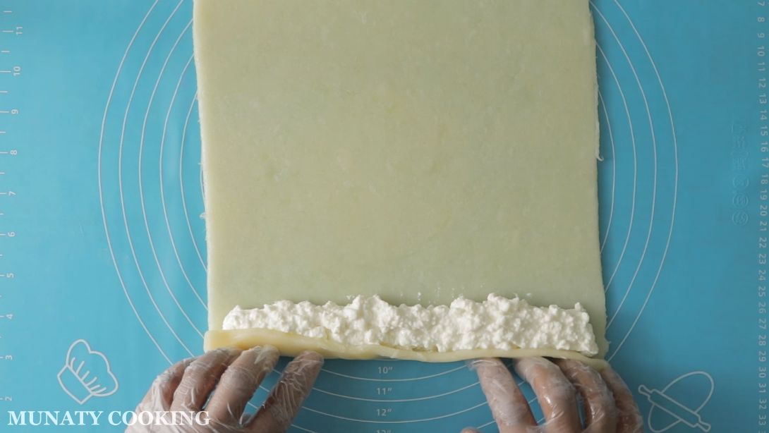 - Add a strip of filling to the edge, roll the dough into logs, and trim the excess.