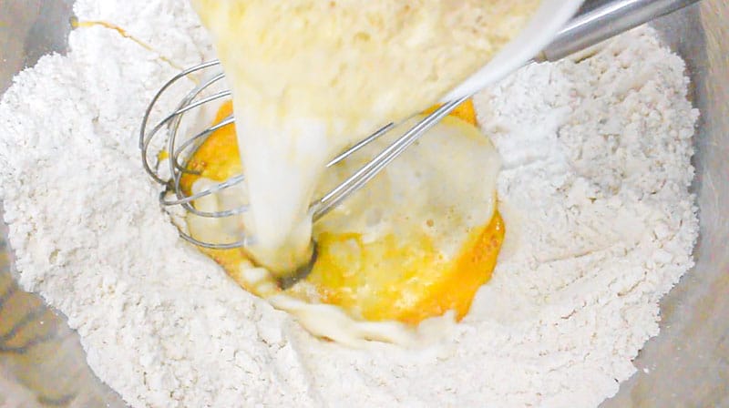 - In a bigger bowl, whisk flour and salt. Create a well in the middle and crack an egg in it.