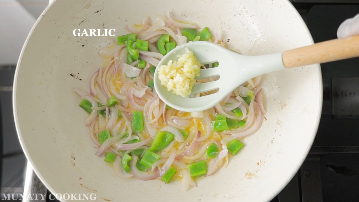 Prepare the vegetables: After removing the chicken from the pan, don’t turn the heat off. In the same pan, add your unsalted butter. Once it’s melted, toss in your thinly sliced onion and chopped green bell pepper. Stir the vegetables until the onion becomes translucent.