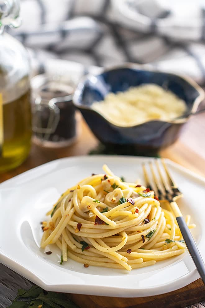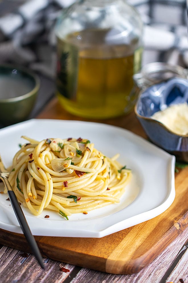Traditionally, the dish mainly consists of spaghetti, garlic, and extra virgin olive oil, but many popular variations of it also include a sprinkle of chopped fresh parsley and red pepper flakes.